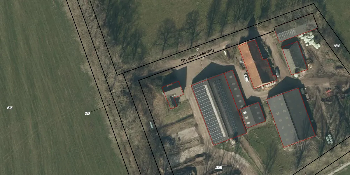 Het perceel waarop Daesdonckseweg 7 staat heeft een oppervlakte van 9120 m². Dit is een zeer groot perceel. De perceeloppervlakte wordt geregistreerd door het Kadaster. Gedetailleerde informatie over de maten van dit perceel kunt u vinden in het rapport Kadastrale kaart met maatvoering van Daesdonckseweg 7.
