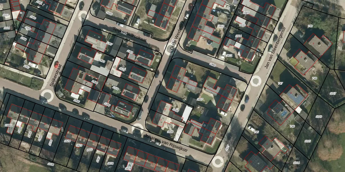 Het perceel waarop Oude Weidestraat 13 staat heeft een oppervlakte van 1605 m². Dit is een zeer groot perceel. De perceeloppervlakte wordt geregistreerd door het Kadaster. Gedetailleerde informatie over de maten van dit perceel kunt u vinden in het rapport Kadastrale kaart met maatvoering van Oude Weidestraat 13.