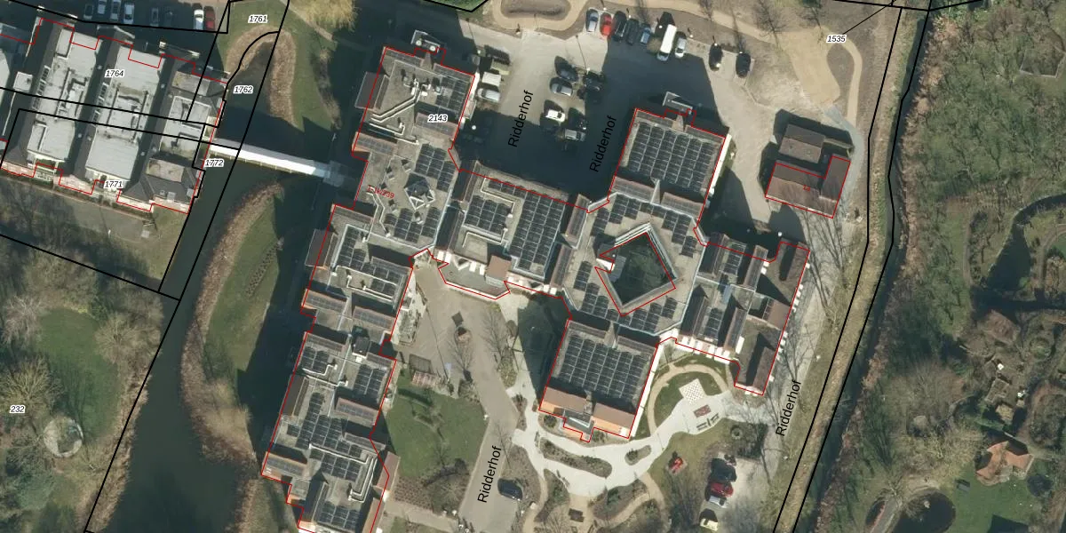 Het perceel waarop Ridderhof 19 staat heeft een oppervlakte van 1,5 ha. Dit is een zeer groot perceel. De perceeloppervlakte wordt geregistreerd door het Kadaster. Gedetailleerde informatie over de maten van dit perceel kunt u vinden in het rapport Kadastrale kaart met maatvoering van Ridderhof 19.