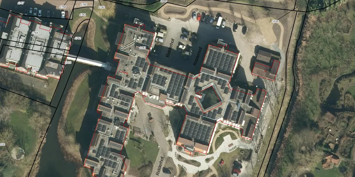 Het perceel waarop Ridderhof 21 staat heeft een oppervlakte van 1,5 ha. Dit is een zeer groot perceel. De perceeloppervlakte wordt geregistreerd door het Kadaster. Gedetailleerde informatie over de maten van dit perceel kunt u vinden in het rapport Kadastrale kaart met maatvoering van Ridderhof 21.