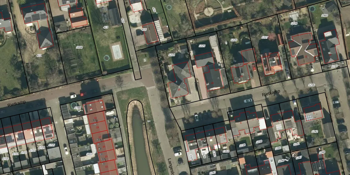 Het perceel waarop Rietkamp 20 staat heeft een oppervlakte van 645 m². Dit is een groot perceel. De perceeloppervlakte wordt geregistreerd door het Kadaster. Gedetailleerde informatie over de maten van dit perceel kunt u vinden in het rapport Kadastrale kaart met maatvoering van Rietkamp 20.