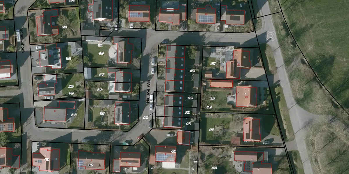 Nieuwe Wei 16 is gelegen op kadastraal perceel VRE00M438. Deze kadastrale aanduiding is uniek en wordt gebruikt door het Kadaster om eigendomsrechten en andere zakelijke rechten vast te leggen. Het perceel maakt onderdeel uit van de kadastrale gemeente Veere.