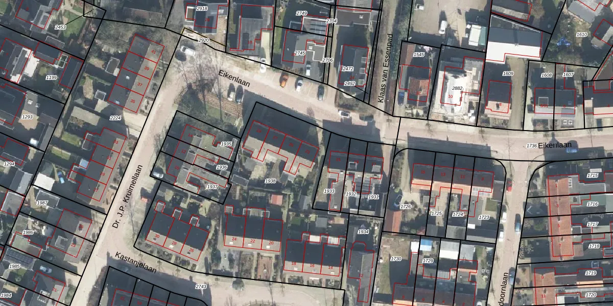 Het perceel waarop Eikenlaan 23 staat heeft een oppervlakte van 2445 m². Dit is een zeer groot perceel. De perceeloppervlakte wordt geregistreerd door het Kadaster. Gedetailleerde informatie over de maten van dit perceel kunt u vinden in het rapport Kadastrale kaart met maatvoering van Eikenlaan 23.