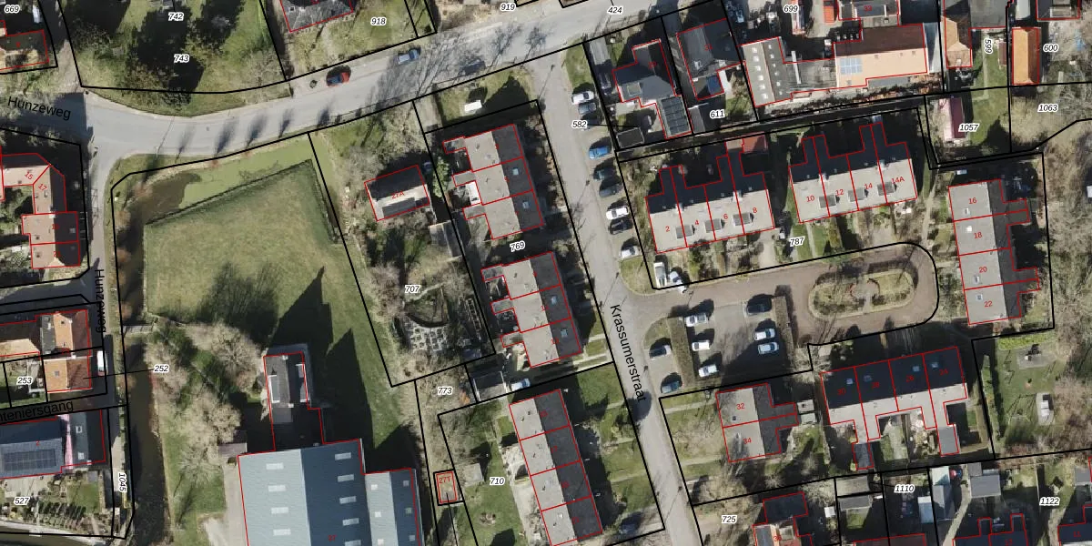Het perceel waarop Krassumerstraat 9 staat heeft een oppervlakte van 1087 m². Dit is een zeer groot perceel. De perceeloppervlakte wordt geregistreerd door het Kadaster. Gedetailleerde informatie over de maten van dit perceel kunt u vinden in het rapport Kadastrale kaart met maatvoering van Krassumerstraat 9.