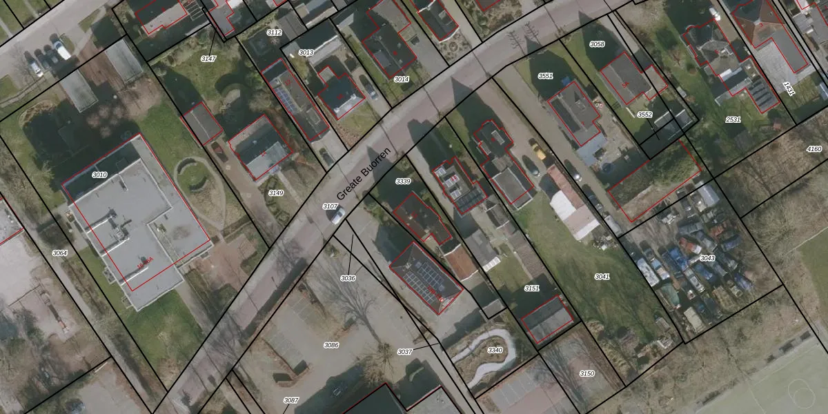 Het perceel waarop Greate Buorren 13 staat heeft een oppervlakte van 375 m². Dit is een groot perceel. De perceeloppervlakte wordt geregistreerd door het Kadaster. Gedetailleerde informatie over de maten van dit perceel kunt u vinden in het rapport Kadastrale kaart met maatvoering van Greate Buorren 13.