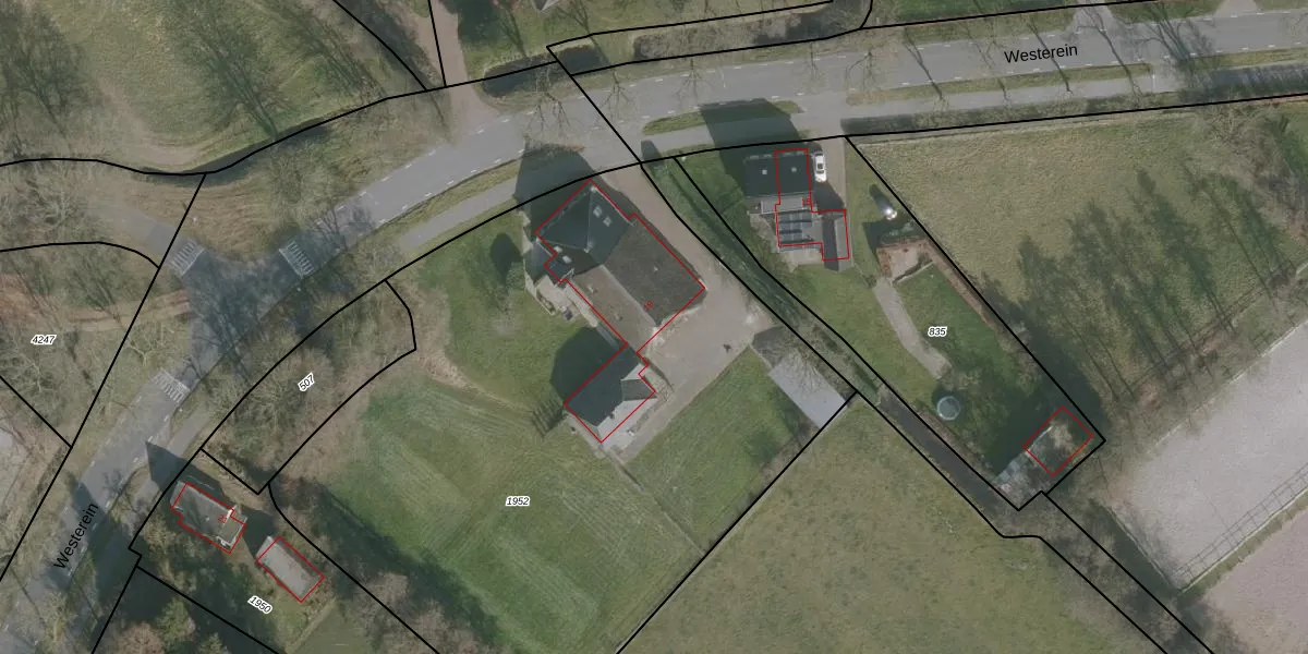 Het perceel waarop Westerein 19 staat heeft een oppervlakte van 4400 m². Dit is een zeer groot perceel. De perceeloppervlakte wordt geregistreerd door het Kadaster. Gedetailleerde informatie over de maten van dit perceel kunt u vinden in het rapport Kadastrale kaart met maatvoering van Westerein 19.