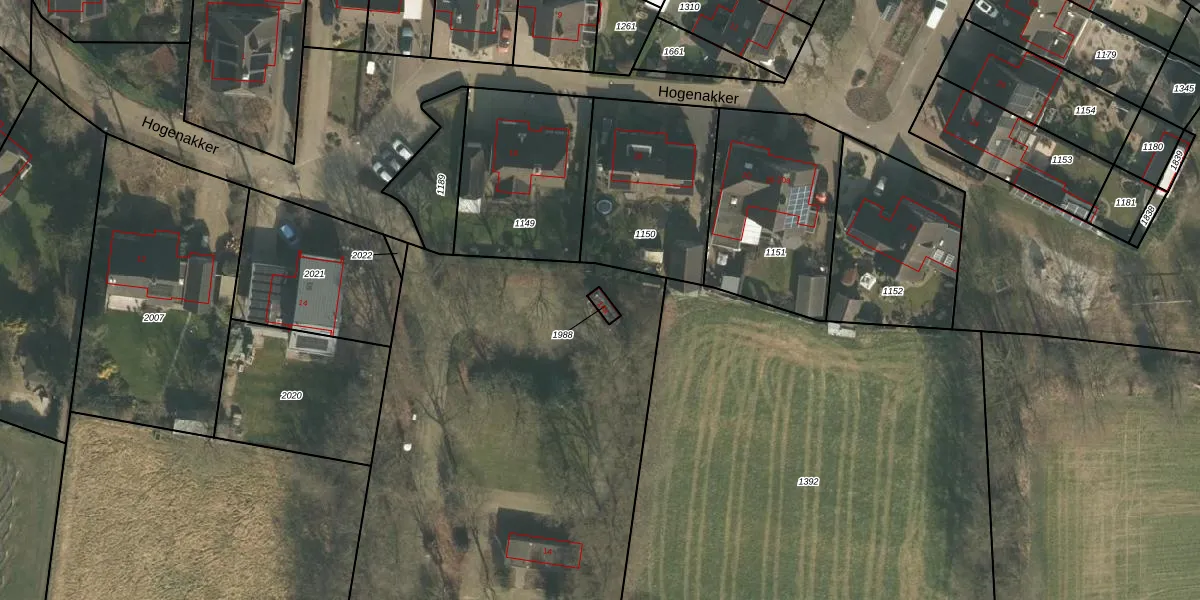 Hogenakker 14-a is gelegen op kadastraal perceel GVE00L1988. Deze kadastrale aanduiding is uniek en wordt gebruikt door het Kadaster om eigendomsrechten en andere zakelijke rechten vast te leggen. Het perceel maakt onderdeel uit van de kadastrale gemeente Grave.