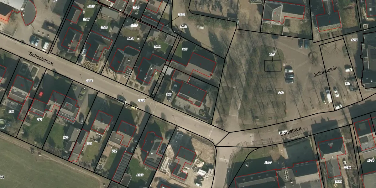 Het perceel waarop Schoolstraat 2 staat heeft een oppervlakte van 613 m². Dit is een groot perceel. De perceeloppervlakte wordt geregistreerd door het Kadaster. Gedetailleerde informatie over de maten van dit perceel kunt u vinden in het rapport Kadastrale kaart met maatvoering van Schoolstraat 2.