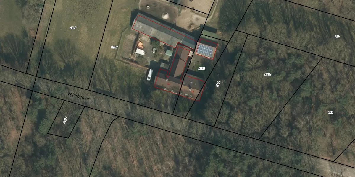 Het perceel waarop Wijnroemer 12 staat heeft een oppervlakte van 3053 m². Dit is een zeer groot perceel. De perceeloppervlakte wordt geregistreerd door het Kadaster. Gedetailleerde informatie over de maten van dit perceel kunt u vinden in het rapport Kadastrale kaart met maatvoering van Wijnroemer 12.