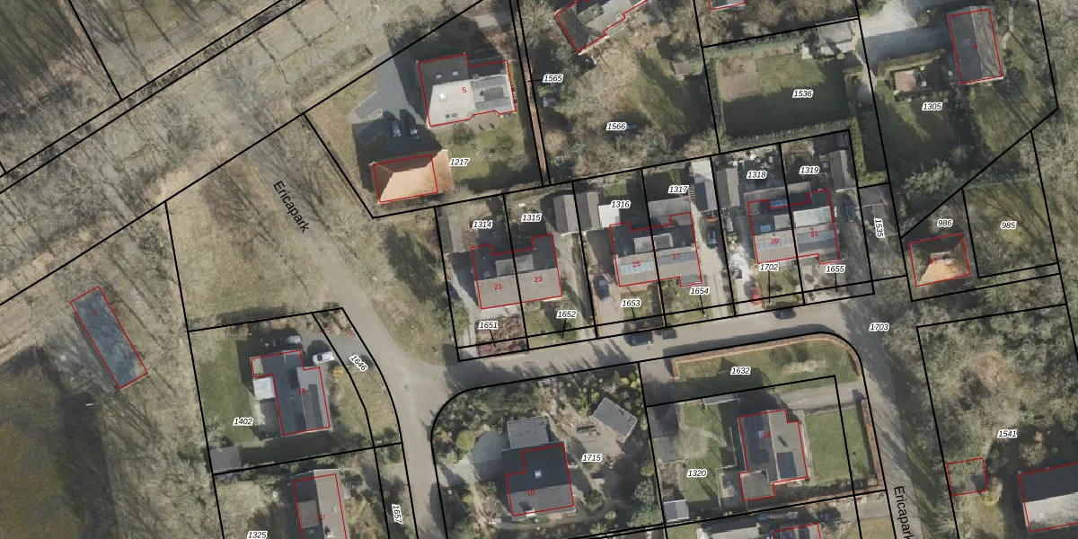 Het perceel waarop Ericapark 23 staat heeft een oppervlakte van 351 m². Dit is een groot perceel. De perceeloppervlakte wordt geregistreerd door het Kadaster. Gedetailleerde informatie over de maten van dit perceel kunt u vinden in het rapport Kadastrale kaart met maatvoering van Ericapark 23.