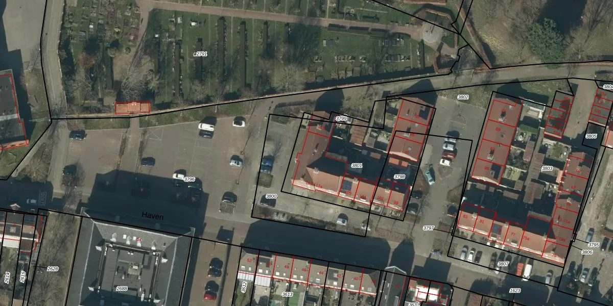 Het perceel waarop Haven 107 staat heeft een oppervlakte van 946 m². Dit is een groot perceel. De perceeloppervlakte wordt geregistreerd door het Kadaster. Gedetailleerde informatie over de maten van dit perceel kunt u vinden in het rapport Kadastrale kaart met maatvoering van Haven 107.