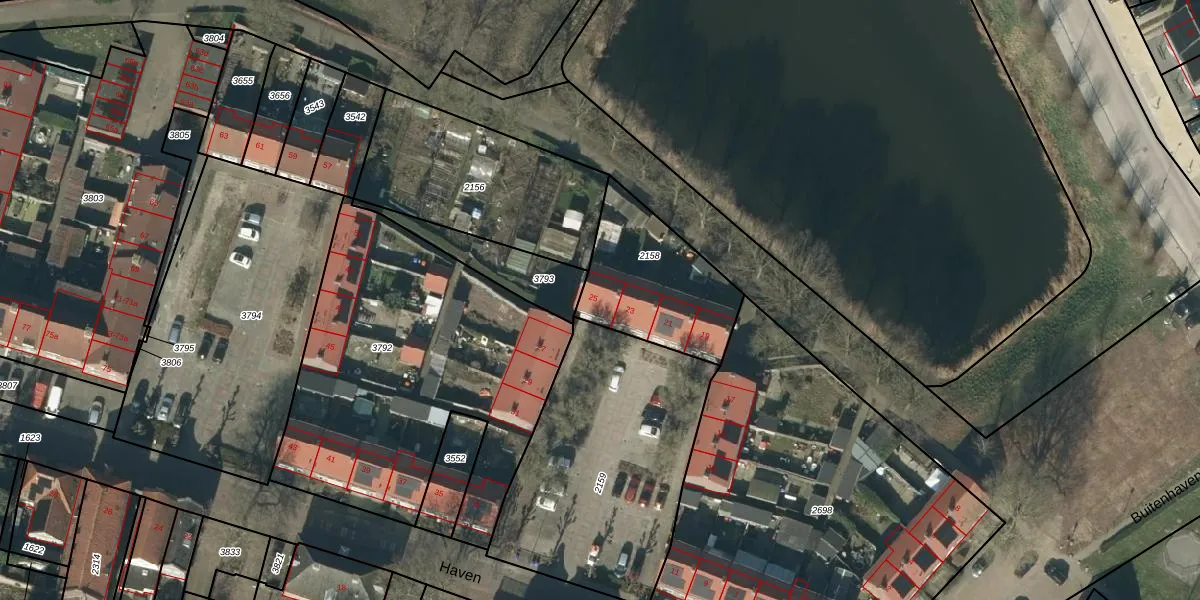 Het perceel waarop Haven 25 staat heeft een oppervlakte van 490 m². Dit is een groot perceel. De perceeloppervlakte wordt geregistreerd door het Kadaster. Gedetailleerde informatie over de maten van dit perceel kunt u vinden in het rapport Kadastrale kaart met maatvoering van Haven 25.