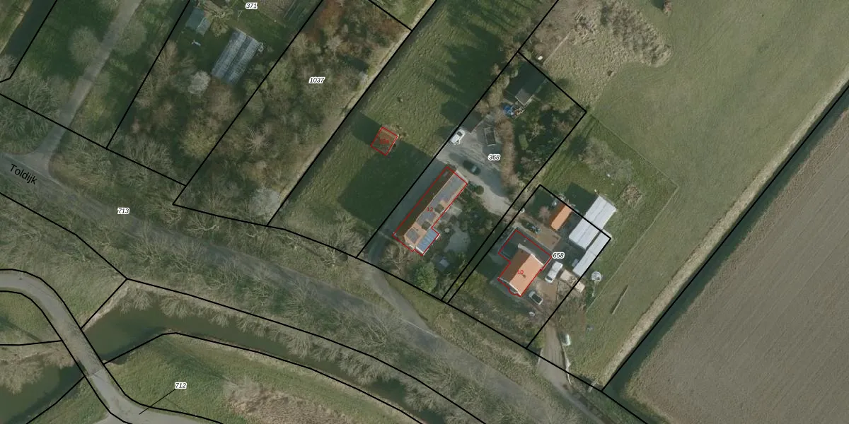 Het perceel waarop Toldijk 12 staat heeft een oppervlakte van 1265 m². Dit is een zeer groot perceel. De perceeloppervlakte wordt geregistreerd door het Kadaster. Gedetailleerde informatie over de maten van dit perceel kunt u vinden in het rapport Kadastrale kaart met maatvoering van Toldijk 12.