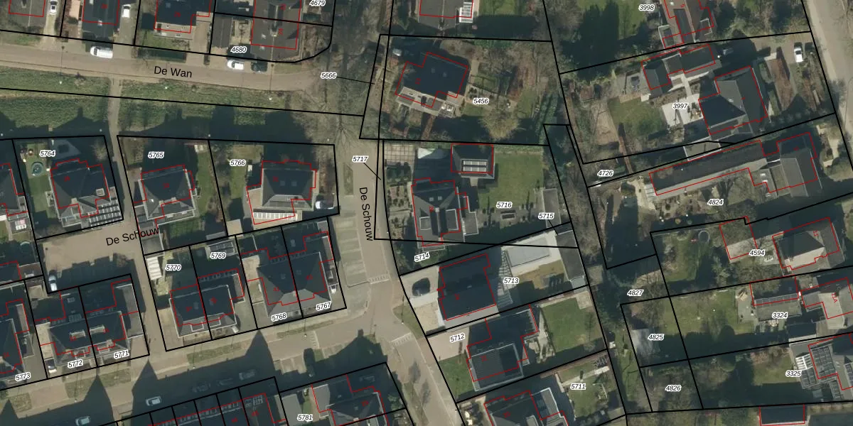Het perceel waarop De Schouw 26 staat heeft een oppervlakte van 930 m². Dit is een groot perceel. De perceeloppervlakte wordt geregistreerd door het Kadaster. Gedetailleerde informatie over de maten van dit perceel kunt u vinden in het rapport Kadastrale kaart met maatvoering van De Schouw 26.