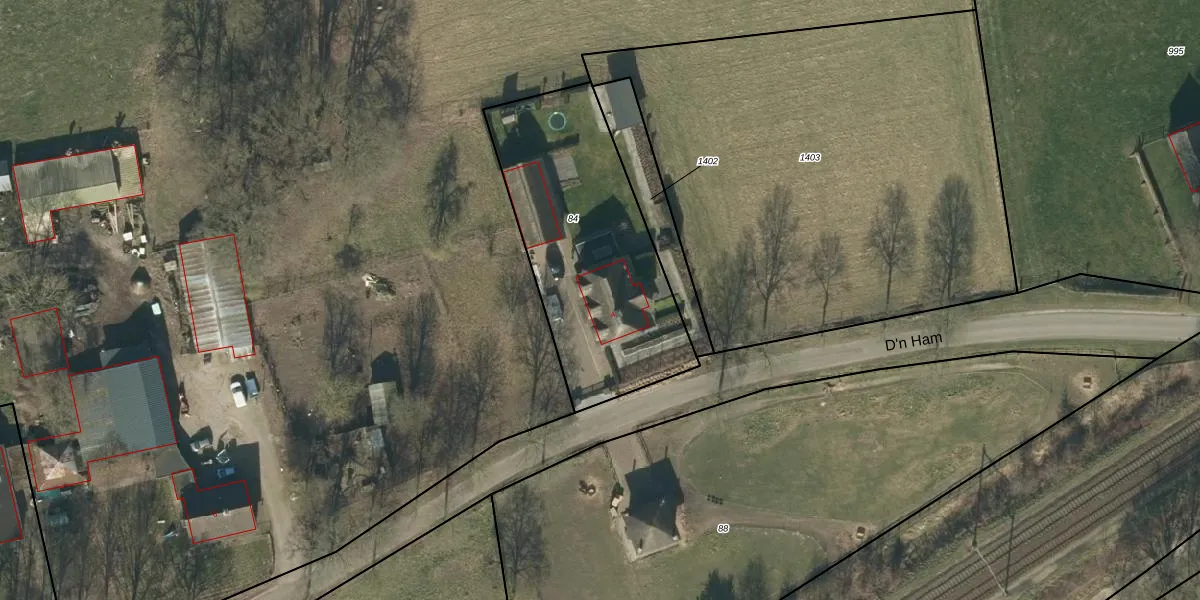 Het perceel waarop D'n Ham 4 staat heeft een oppervlakte van 1060 m². Dit is een zeer groot perceel. De perceeloppervlakte wordt geregistreerd door het Kadaster. Gedetailleerde informatie over de maten van dit perceel kunt u vinden in het rapport Kadastrale kaart met maatvoering van D'n Ham 4.