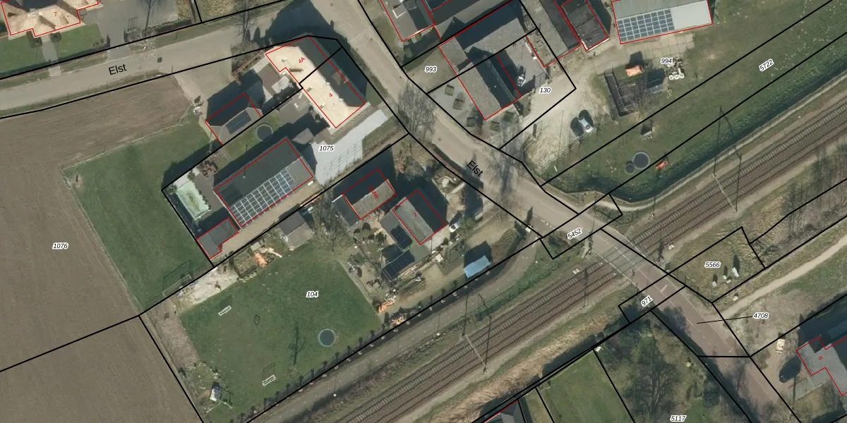 Het perceel waarop Elst 2 staat heeft een oppervlakte van 2960 m². Dit is een zeer groot perceel. De perceeloppervlakte wordt geregistreerd door het Kadaster. Gedetailleerde informatie over de maten van dit perceel kunt u vinden in het rapport Kadastrale kaart met maatvoering van Elst 2.