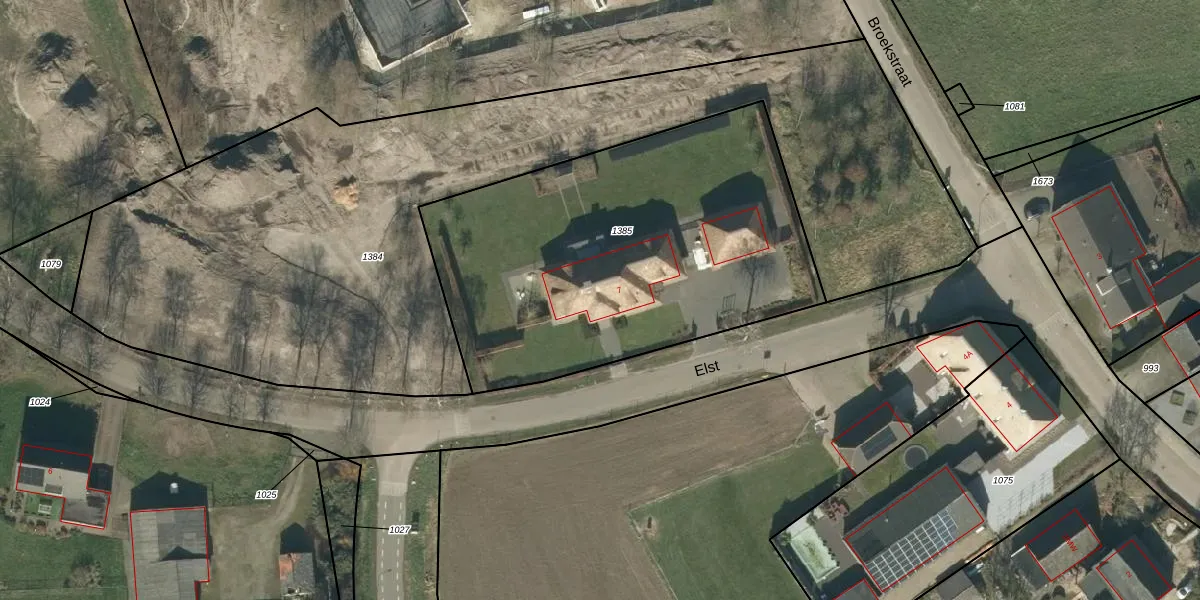 Het perceel waarop Elst 7 staat heeft een oppervlakte van 2090 m². Dit is een zeer groot perceel. De perceeloppervlakte wordt geregistreerd door het Kadaster. Gedetailleerde informatie over de maten van dit perceel kunt u vinden in het rapport Kadastrale kaart met maatvoering van Elst 7.