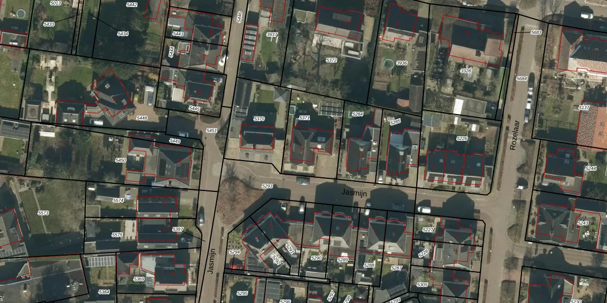 Het perceel waarop Jasmijn 12 staat heeft een oppervlakte van 492 m². Dit is een groot perceel. De perceeloppervlakte wordt geregistreerd door het Kadaster. Gedetailleerde informatie over de maten van dit perceel kunt u vinden in het rapport Kadastrale kaart met maatvoering van Jasmijn 12.