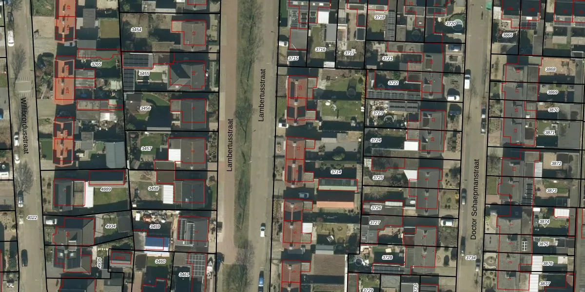 Het perceel waarop Lambertusstraat 11 staat heeft een oppervlakte van 2488 m². Dit is een zeer groot perceel. De perceeloppervlakte wordt geregistreerd door het Kadaster. Gedetailleerde informatie over de maten van dit perceel kunt u vinden in het rapport Kadastrale kaart met maatvoering van Lambertusstraat 11.