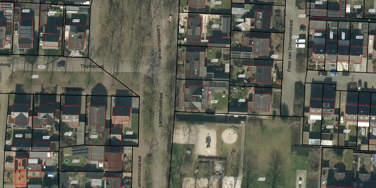 Het perceel waarop Lambertusstraat 17 staat heeft een oppervlakte van 497 m². Dit is een groot perceel. De perceeloppervlakte wordt geregistreerd door het Kadaster. Gedetailleerde informatie over de maten van dit perceel kunt u vinden in het rapport Kadastrale kaart met maatvoering van Lambertusstraat 17.