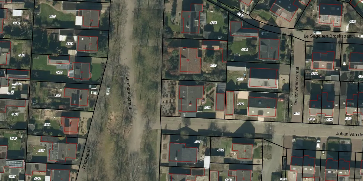 Het perceel waarop Lambertusstraat 27 staat heeft een oppervlakte van 727 m². Dit is een groot perceel. De perceeloppervlakte wordt geregistreerd door het Kadaster. Gedetailleerde informatie over de maten van dit perceel kunt u vinden in het rapport Kadastrale kaart met maatvoering van Lambertusstraat 27.
