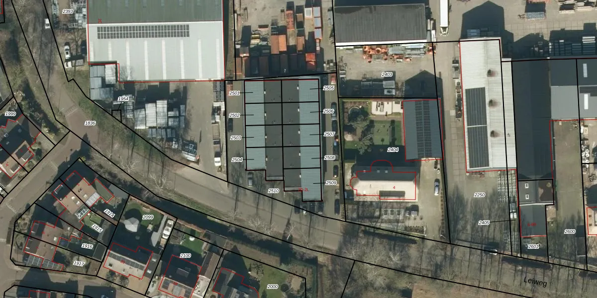 Leiweg 2-K is gelegen op kadastraal perceel GFN00B2508. Deze kadastrale aanduiding is uniek en wordt gebruikt door het Kadaster om eigendomsrechten en andere zakelijke rechten vast te leggen. Het perceel maakt onderdeel uit van de kadastrale gemeente Geffen.