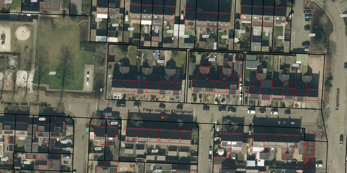 Pater van den Elsenstraat 19 is gelegen op kadastraal perceel GFN00C5097. Deze kadastrale aanduiding is uniek en wordt gebruikt door het Kadaster om eigendomsrechten en andere zakelijke rechten vast te leggen. Het perceel maakt onderdeel uit van de kadastrale gemeente Geffen.