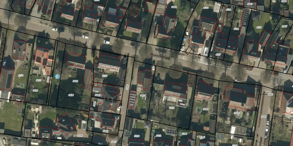 Het perceel waarop Runrotstraat 23 staat heeft een oppervlakte van 570 m². Dit is een groot perceel. De perceeloppervlakte wordt geregistreerd door het Kadaster. Gedetailleerde informatie over de maten van dit perceel kunt u vinden in het rapport Kadastrale kaart met maatvoering van Runrotstraat 23.