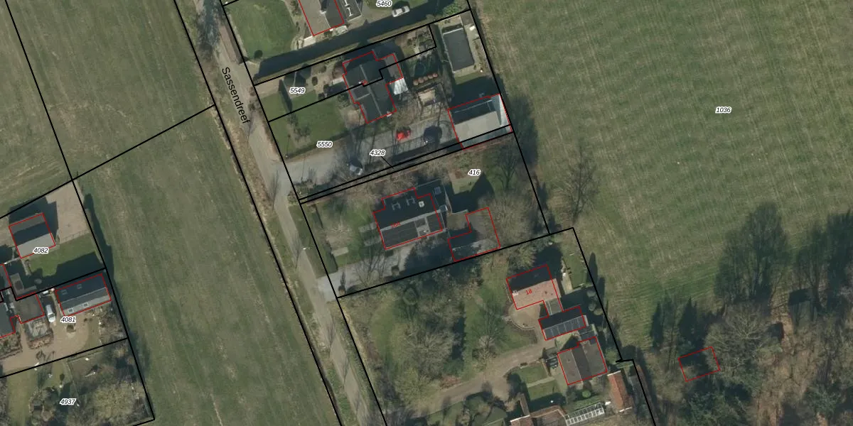 Sassendreef 16-A is gelegen op kadastraal perceel GFN00D416. Deze kadastrale aanduiding is uniek en wordt gebruikt door het Kadaster om eigendomsrechten en andere zakelijke rechten vast te leggen. Het perceel maakt onderdeel uit van de kadastrale gemeente Geffen.