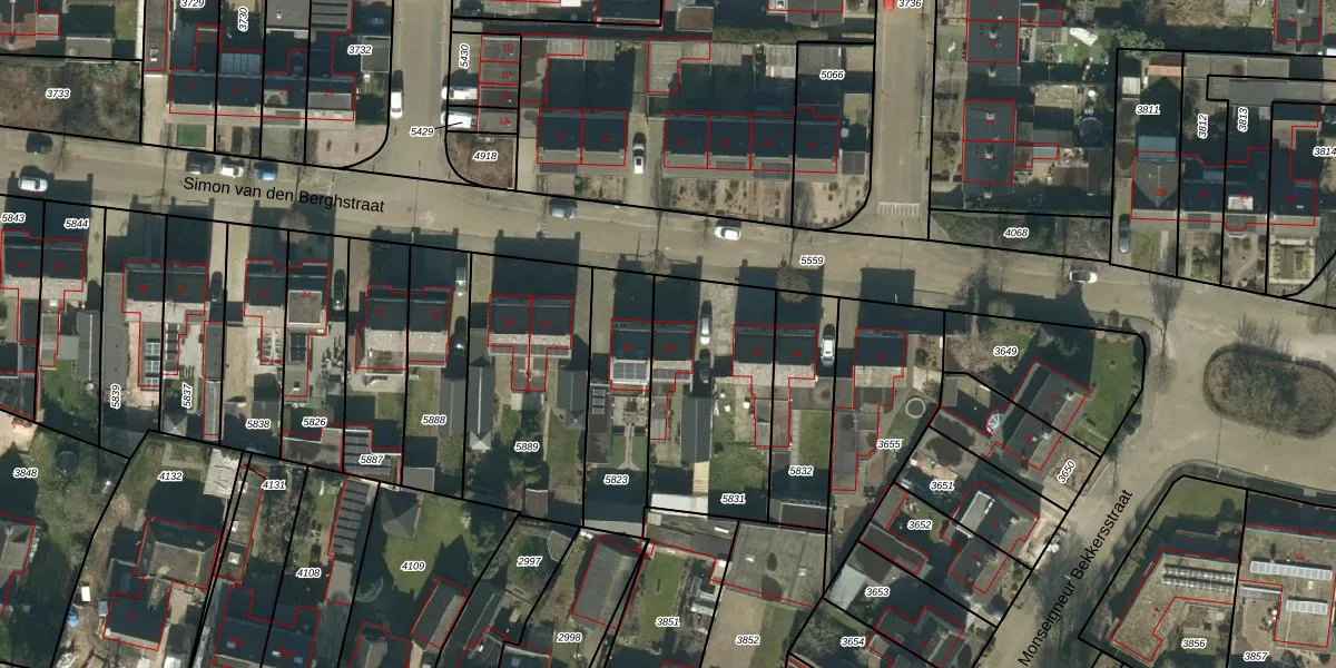 Simon van den Berghstraat 36 is gelegen op kadastraal perceel GFN00C5831. Deze kadastrale aanduiding is uniek en wordt gebruikt door het Kadaster om eigendomsrechten en andere zakelijke rechten vast te leggen. Het perceel maakt onderdeel uit van de kadastrale gemeente Geffen.
