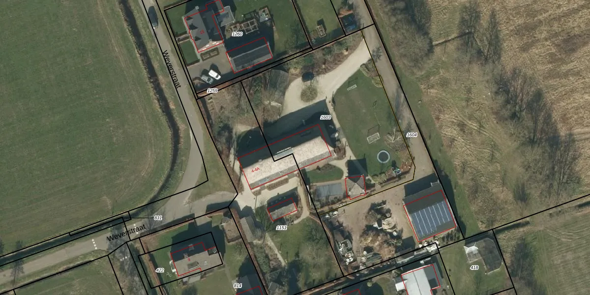 Het perceel waarop Weverstraat 4-A staat heeft een oppervlakte van 2155 m². Dit is een zeer groot perceel. De perceeloppervlakte wordt geregistreerd door het Kadaster. Gedetailleerde informatie over de maten van dit perceel kunt u vinden in het rapport Kadastrale kaart met maatvoering van Weverstraat 4-A.
