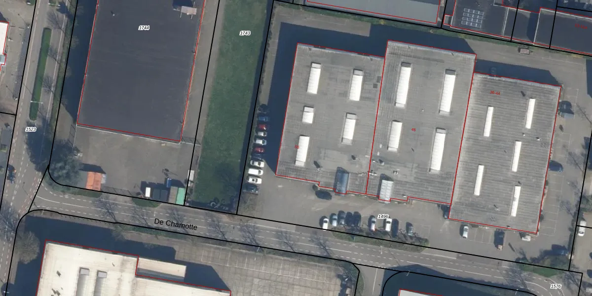 Het perceel waarop De Chamotte 50 staat heeft een oppervlakte van 8355 m². Dit is een zeer groot perceel. De perceeloppervlakte wordt geregistreerd door het Kadaster. Gedetailleerde informatie over de maten van dit perceel kunt u vinden in het rapport Kadastrale kaart met maatvoering van De Chamotte 50.