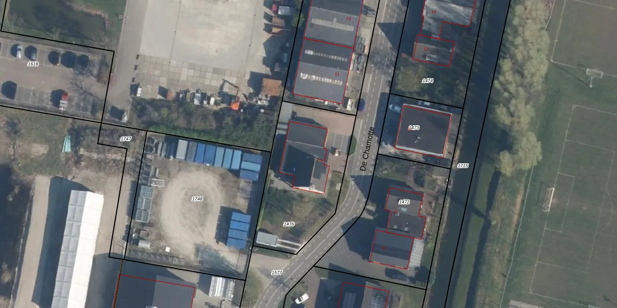 Het perceel waarop De Chamotte 9 staat heeft een oppervlakte van 1075 m². Dit is een zeer groot perceel. De perceeloppervlakte wordt geregistreerd door het Kadaster. Gedetailleerde informatie over de maten van dit perceel kunt u vinden in het rapport Kadastrale kaart met maatvoering van De Chamotte 9.
