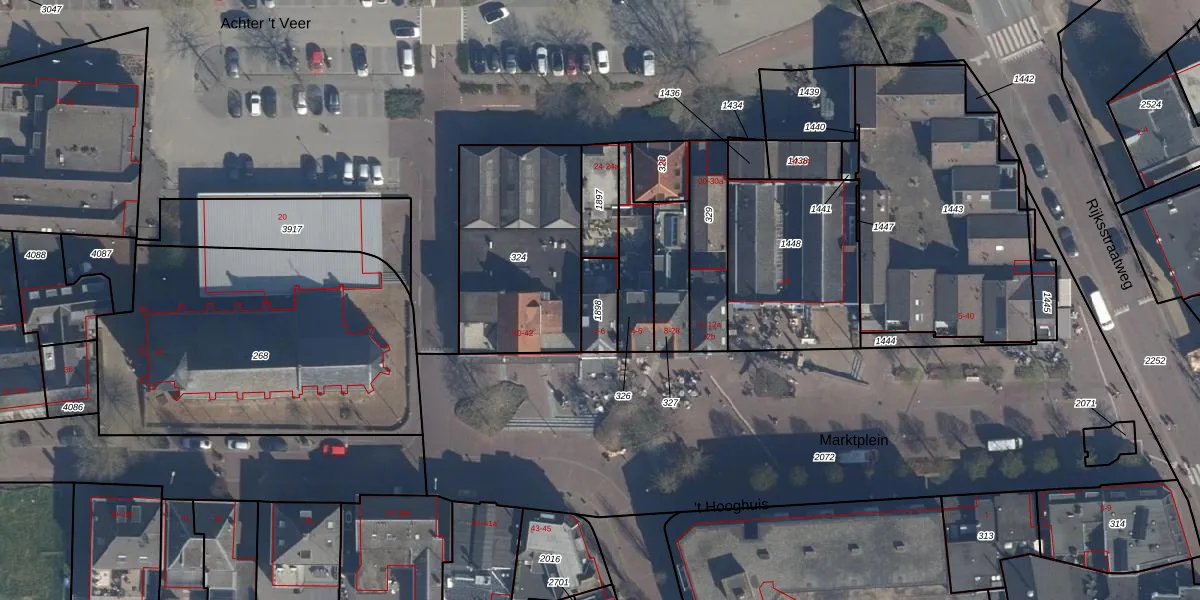Het perceel waarop Marktplein 2 staat heeft een oppervlakte van 99 m². Dit is een klein perceel. De perceeloppervlakte wordt geregistreerd door het Kadaster. Gedetailleerde informatie over de maten van dit perceel kunt u vinden in het rapport Kadastrale kaart met maatvoering van Marktplein 2.