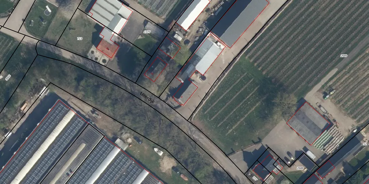 Het perceel waarop Uiterdijk 9 staat heeft een oppervlakte van 1,0 ha. Dit is een zeer groot perceel. De perceeloppervlakte wordt geregistreerd door het Kadaster. Gedetailleerde informatie over de maten van dit perceel kunt u vinden in het rapport Kadastrale kaart met maatvoering van Uiterdijk 9.