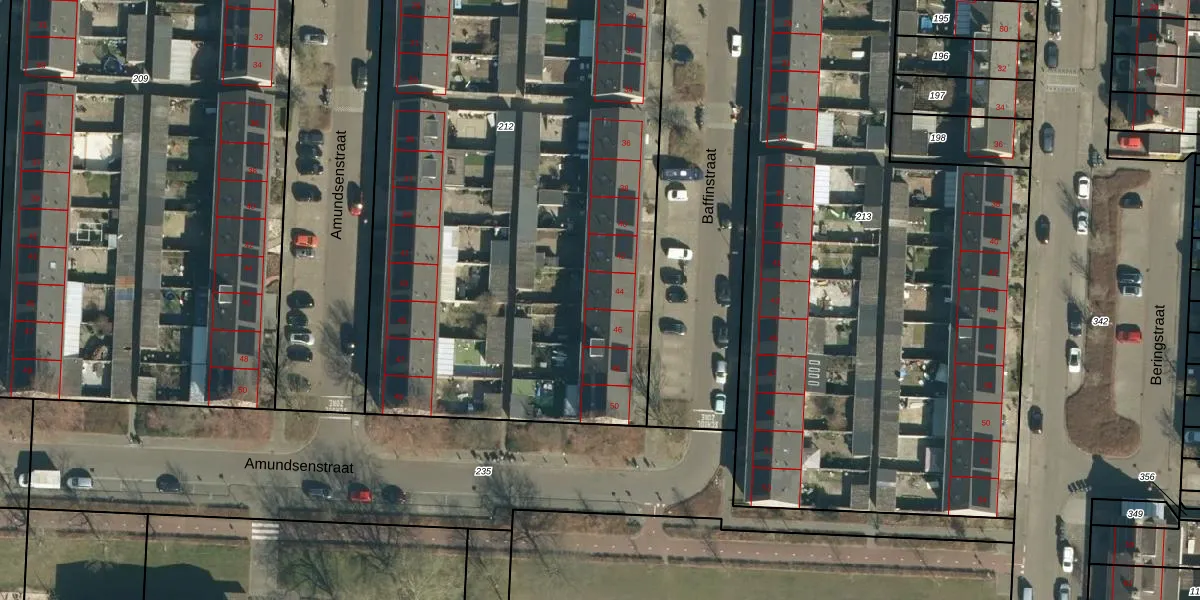 Het perceel waarop Baffinstraat 44 staat heeft een oppervlakte van 4912 m². Dit is een zeer groot perceel. De perceeloppervlakte wordt geregistreerd door het Kadaster. Gedetailleerde informatie over de maten van dit perceel kunt u vinden in het rapport Kadastrale kaart met maatvoering van Baffinstraat 44.