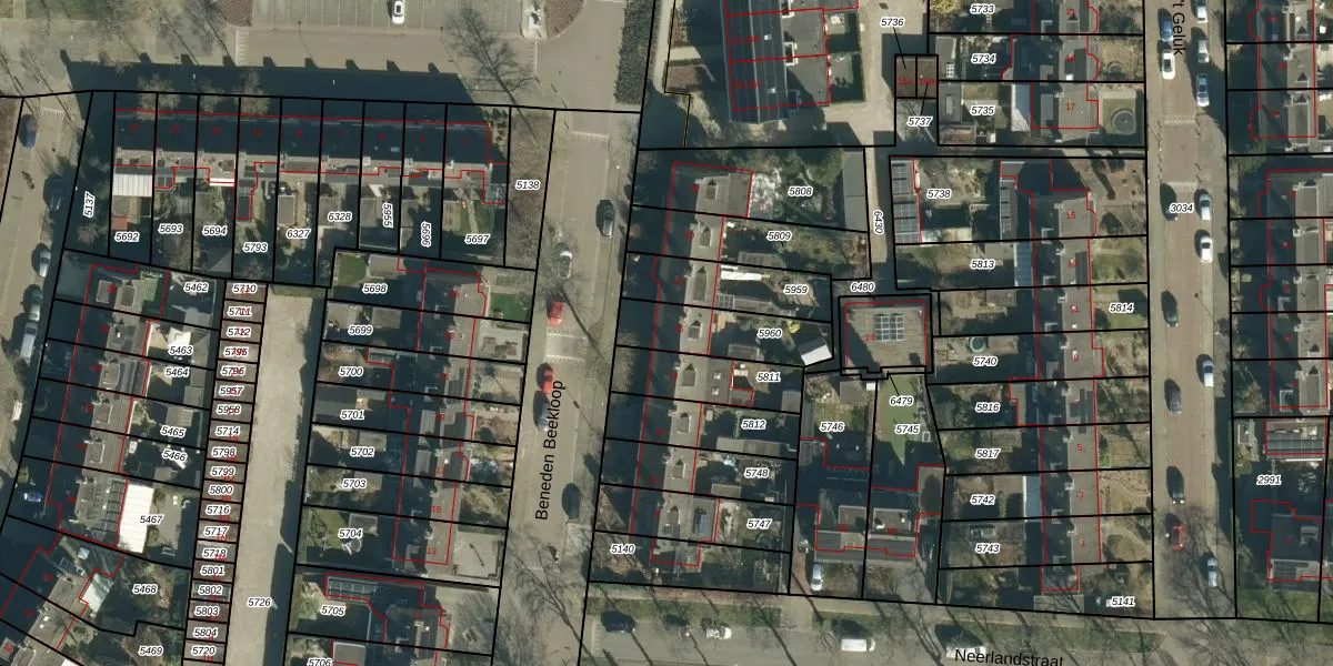 Beneden Beekloop 16 is gelegen op kadastraal perceel GDP00D5960. Deze kadastrale aanduiding is uniek en wordt gebruikt door het Kadaster om eigendomsrechten en andere zakelijke rechten vast te leggen. Het perceel maakt onderdeel uit van de kadastrale gemeente Geldrop.