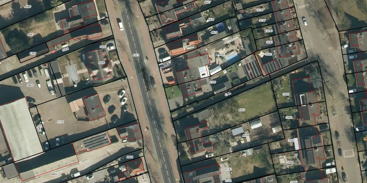 Het perceel waarop Bogardeind 175 staat heeft een oppervlakte van 612 m². Dit is een groot perceel. De perceeloppervlakte wordt geregistreerd door het Kadaster. Gedetailleerde informatie over de maten van dit perceel kunt u vinden in het rapport Kadastrale kaart met maatvoering van Bogardeind 175.