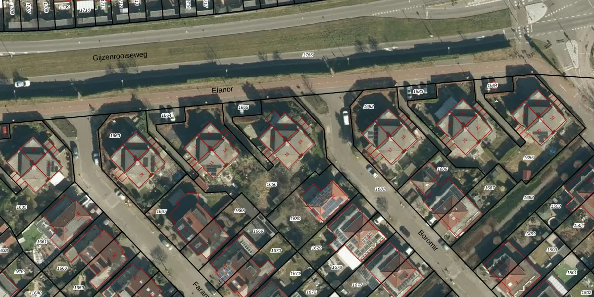 Het perceel waarop Boromir 24 staat heeft een oppervlakte van 1338 m². Dit is een zeer groot perceel. De perceeloppervlakte wordt geregistreerd door het Kadaster. Gedetailleerde informatie over de maten van dit perceel kunt u vinden in het rapport Kadastrale kaart met maatvoering van Boromir 24.