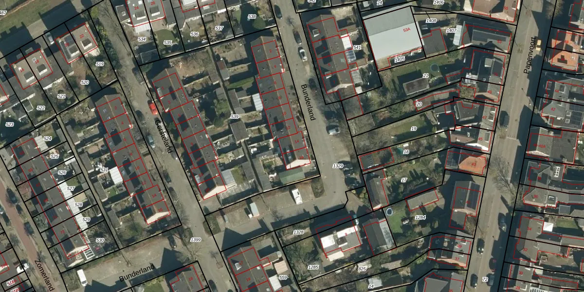 Het perceel waarop Bunderland 14 staat heeft een oppervlakte van 2472 m². Dit is een zeer groot perceel. De perceeloppervlakte wordt geregistreerd door het Kadaster. Gedetailleerde informatie over de maten van dit perceel kunt u vinden in het rapport Kadastrale kaart met maatvoering van Bunderland 14.