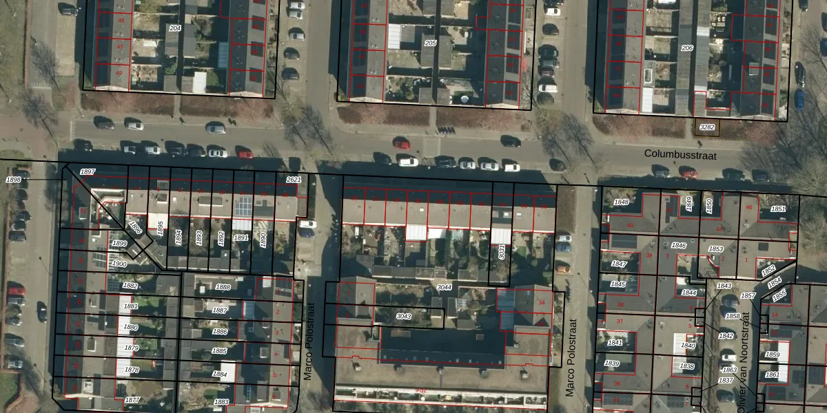 Het perceel waarop Columbusstraat 26 staat heeft een oppervlakte van 2792 m². Dit is een zeer groot perceel. De perceeloppervlakte wordt geregistreerd door het Kadaster. Gedetailleerde informatie over de maten van dit perceel kunt u vinden in het rapport Kadastrale kaart met maatvoering van Columbusstraat 26.