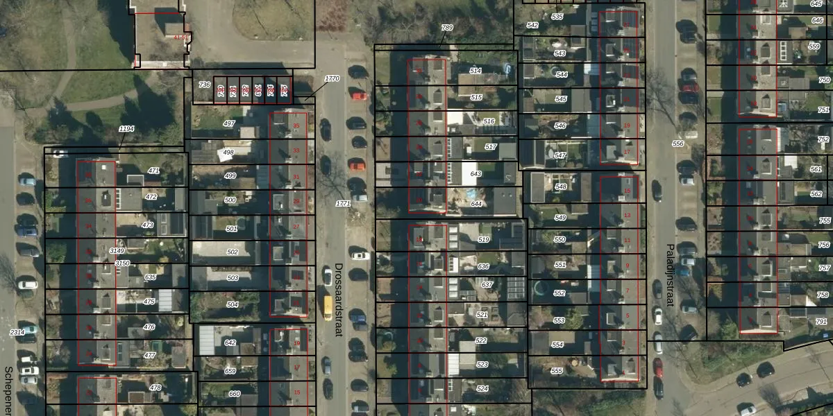 Gebruik de zoekbalk of klik op een perceel voor informatie over de adressen binnen dit perceel.