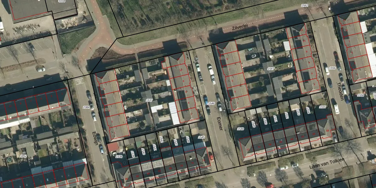 Het perceel waarop Eomer 6 staat heeft een oppervlakte van 2048 m². Dit is een zeer groot perceel. De perceeloppervlakte wordt geregistreerd door het Kadaster. Gedetailleerde informatie over de maten van dit perceel kunt u vinden in het rapport Kadastrale kaart met maatvoering van Eomer 6.