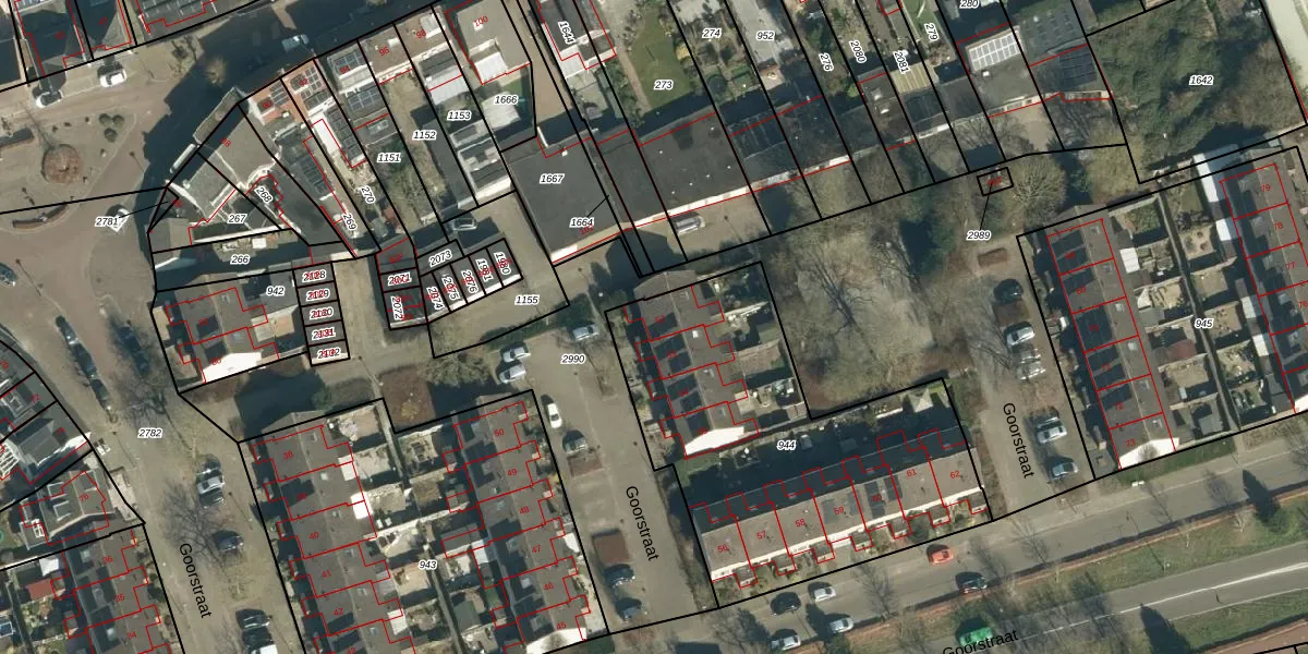 Het perceel waarop Goorstraat 52 staat heeft een oppervlakte van 1671 m². Dit is een zeer groot perceel. De perceeloppervlakte wordt geregistreerd door het Kadaster. Gedetailleerde informatie over de maten van dit perceel kunt u vinden in het rapport Kadastrale kaart met maatvoering van Goorstraat 52.