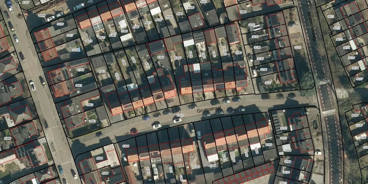 Gruttostraat 13 is gelegen op kadastraal perceel GDP00C6345. Deze kadastrale aanduiding is uniek en wordt gebruikt door het Kadaster om eigendomsrechten en andere zakelijke rechten vast te leggen. Het perceel maakt onderdeel uit van de kadastrale gemeente Geldrop.