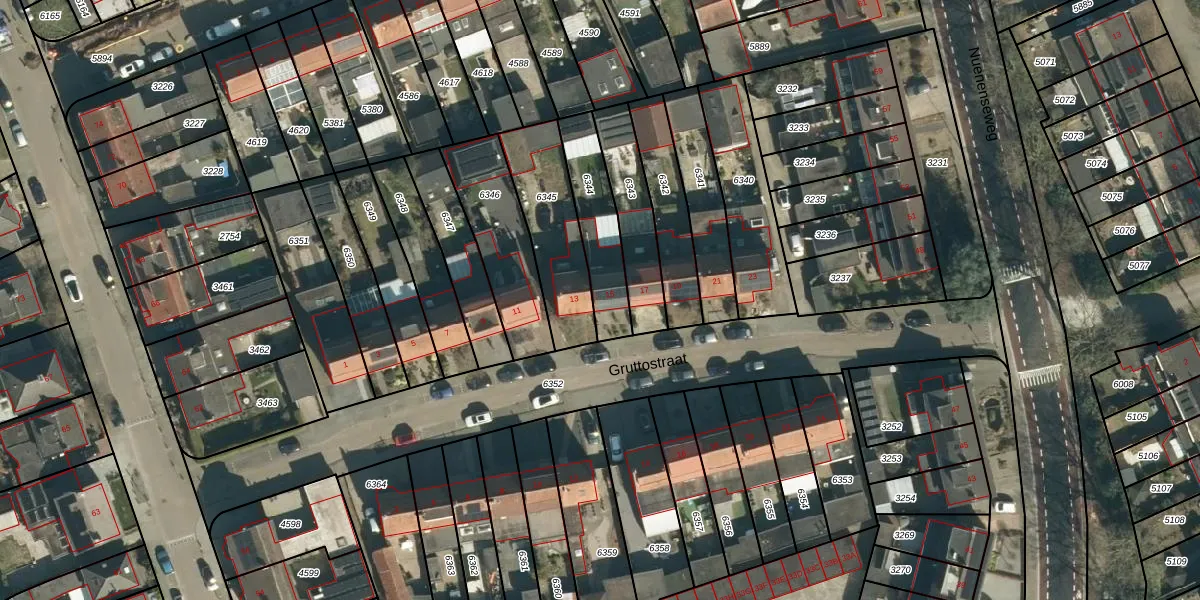 Gruttostraat 15 is gelegen op kadastraal perceel GDP00C6344. Deze kadastrale aanduiding is uniek en wordt gebruikt door het Kadaster om eigendomsrechten en andere zakelijke rechten vast te leggen. Het perceel maakt onderdeel uit van de kadastrale gemeente Geldrop.