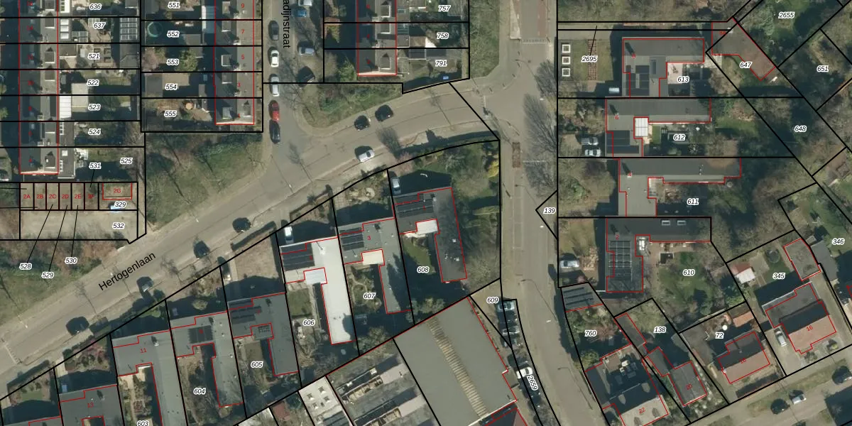 Hertogenlaan 1 is gelegen op kadastraal perceel GDP00E608. Deze kadastrale aanduiding is uniek en wordt gebruikt door het Kadaster om eigendomsrechten en andere zakelijke rechten vast te leggen. Het perceel maakt onderdeel uit van de kadastrale gemeente Geldrop.