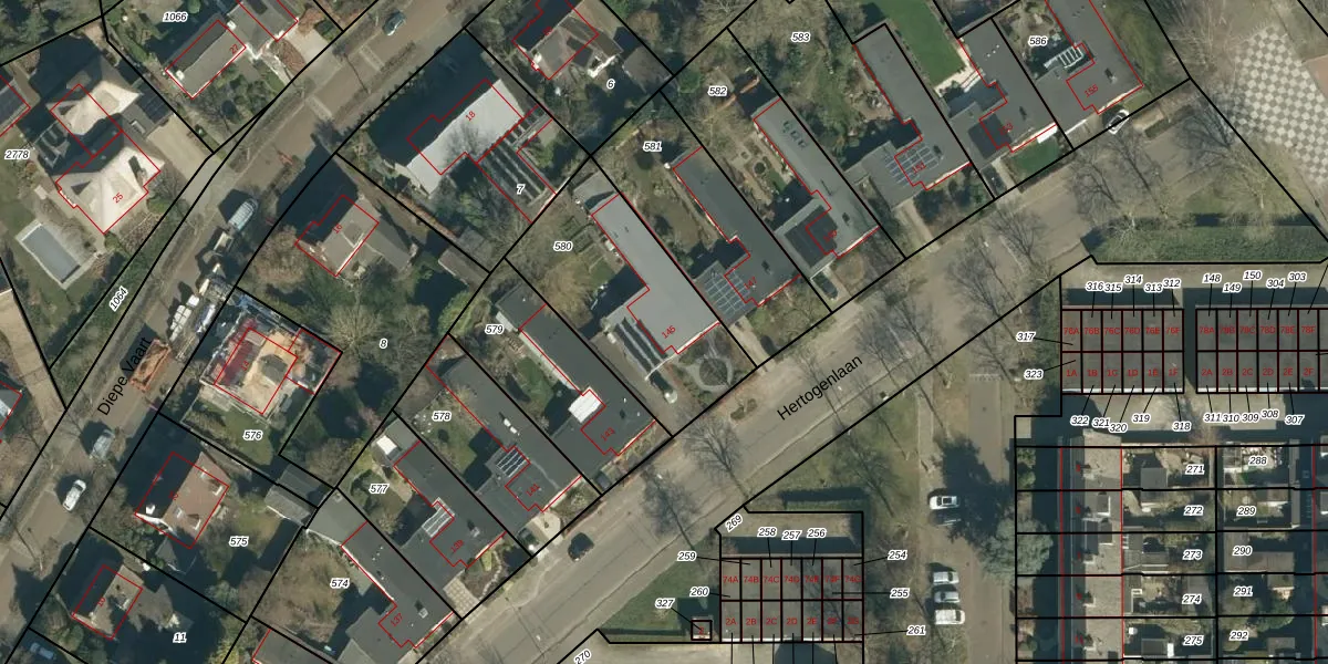 Het perceel waarop Hertogenlaan 145 staat heeft een oppervlakte van 703 m². Dit is een groot perceel. De perceeloppervlakte wordt geregistreerd door het Kadaster. Gedetailleerde informatie over de maten van dit perceel kunt u vinden in het rapport Kadastrale kaart met maatvoering van Hertogenlaan 145.