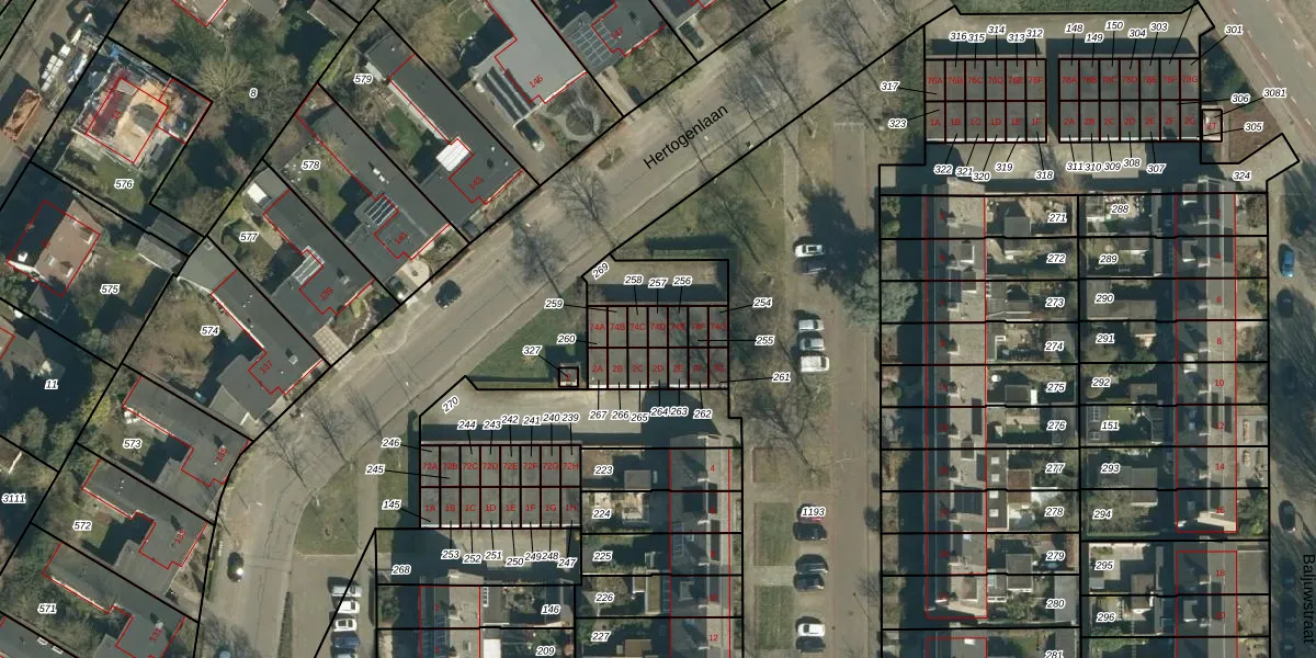 Hertogenlaan 74-D is gelegen op kadastraal perceel GDP00E257. Deze kadastrale aanduiding is uniek en wordt gebruikt door het Kadaster om eigendomsrechten en andere zakelijke rechten vast te leggen. Het perceel maakt onderdeel uit van de kadastrale gemeente Geldrop.