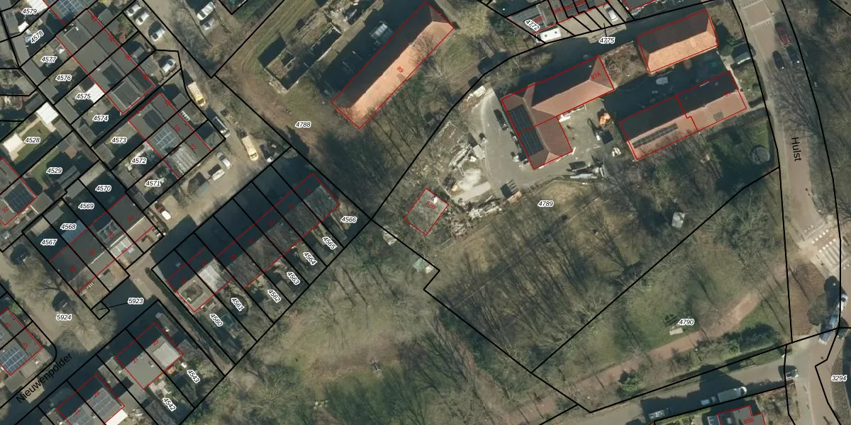 Het perceel waarop Hulst 87-B staat heeft een oppervlakte van 4815 m². Dit is een zeer groot perceel. De perceeloppervlakte wordt geregistreerd door het Kadaster. Gedetailleerde informatie over de maten van dit perceel kunt u vinden in het rapport Kadastrale kaart met maatvoering van Hulst 87-B.